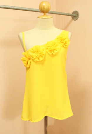NEW NEW !!!394D- เสื้อกล้ามผ้าชีฟอง สายเดี่ยวข้างเดียว แต่งติดดอกไม้รอบอก สีเหลือง ทรงสวยค่ะ สีสันน่ารักเข้ากับ Summer นี้มากๆค่ะ