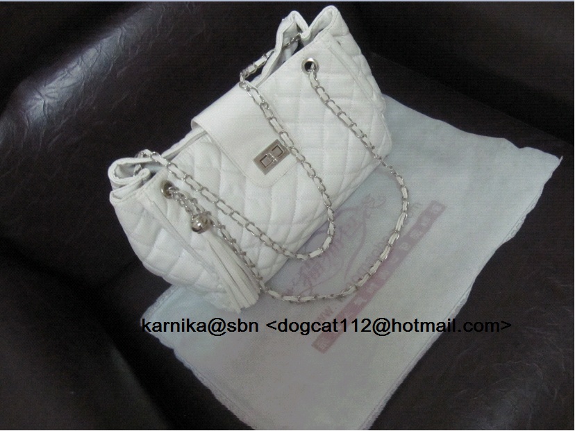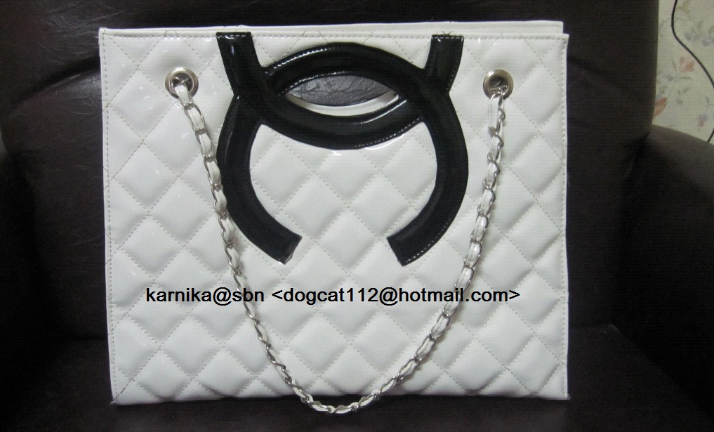 ปิดท้ายกับกระเป๋าสุดหรูสีขาวสายสะพายโซ่ สกรีนลายตัวซีสีดำ หรูหราน่าใช้ สภาพเริ่ด เป๊ะ!!
