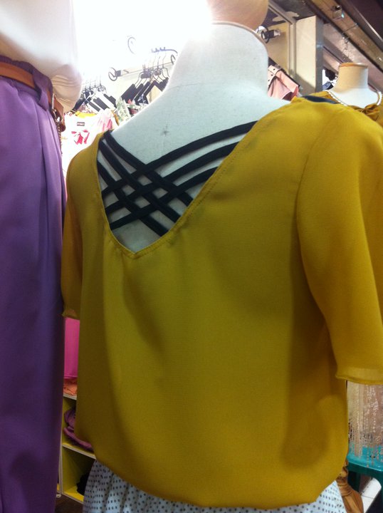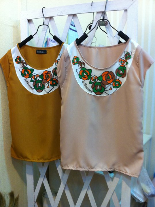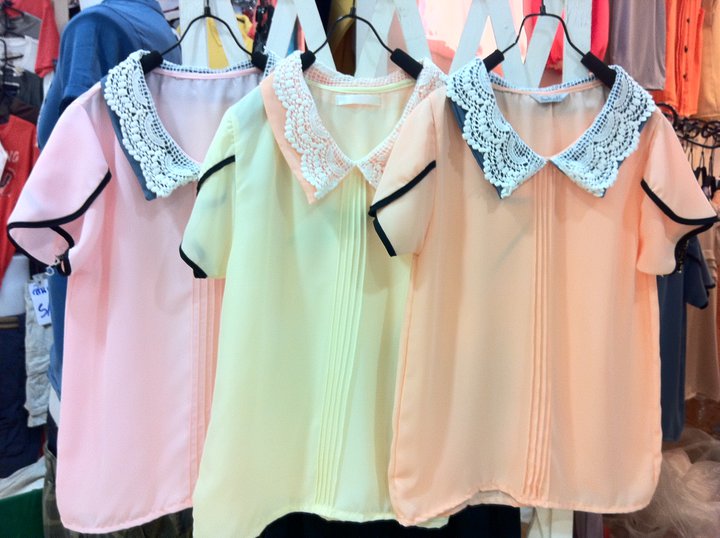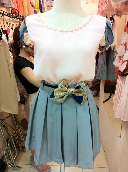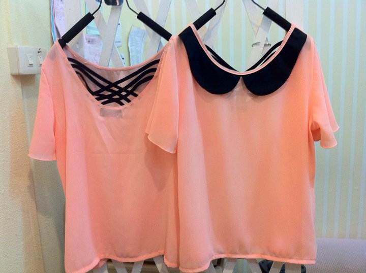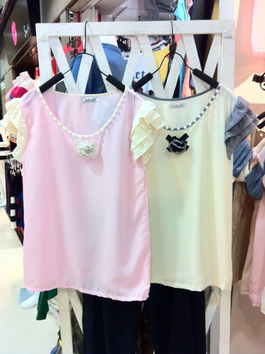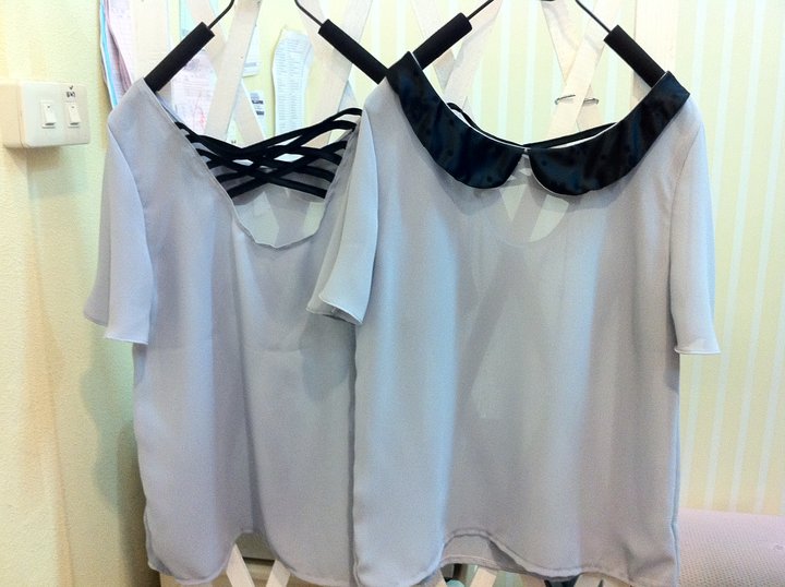 เสื้อชีฟองปกสองชั้น ทับด้วยผ้าซีทรูลายหัวใจ ตรงกลางตีเกล็ดยาวลงมา 350 บาท