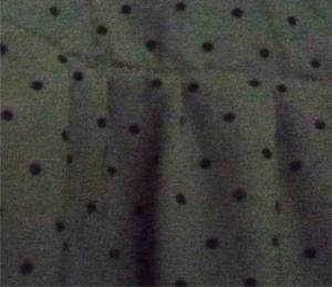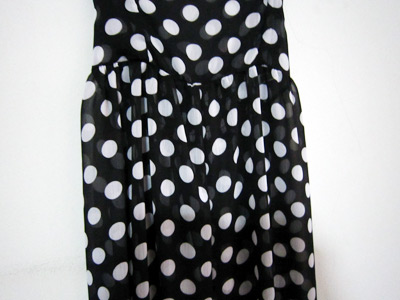 ผ้าชีฟองลายจุดขาว พื้นดำ ใส่แล้วรู้สึกเย็นๆค่ะ ไม่ร้อน ด้านหลังจับสม็อก