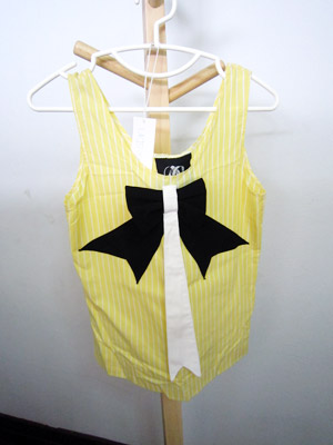 แบรนด์ดังจากจตุจักรค่ะ เสื้อแขนกุดสีเหลืองสดใสลายตรง แต่งโบว์ด้านหน้า