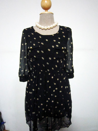 ชุดเดรสผ้าชีฟองลายจุดใหญ่ตกแต่งกระเป๋าหน้าสองข้างที่หน้าอก และกระดุมสีทอง ซับในในตัวสีดำ