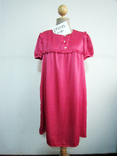 เดรสสั้นผ้าซาตินสีชมพูปริ๊ด ตัวผ้าเป็นลายจุด แขนสั้นกุ๊นขอบ มีจับระบายเล็กๆรอบคอ และรอบวงแขน