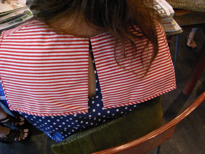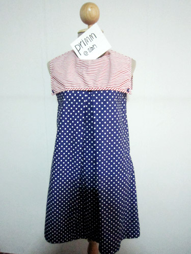 (used once สภาพดีเหมือนใหม่) เดรสปกกะลาสี ตัวเดรสเป็นผ้าลายจุดขาวน้ำเงิน ทรงเอ จับทวิตข้างหน้า ส่วนตัวปกเป็นผ้าลายทางขาวแดง ติดกระดุมหลังหนึ่งเม็ด