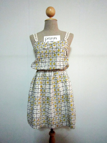 เชิ้ตเดรส ท่อนบนเป็นเชิ้ตคอบัวติดกระดุมปั๊มผ้าลายเดี่ยวกับตัวเสื้อ เข้ากุ๊นเล็กๆ
