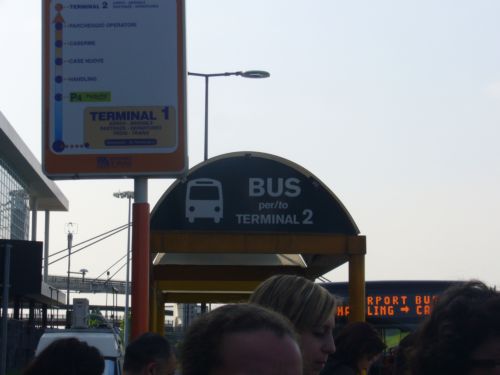 พอลงรถไฟที่ Malpensa Airport รถไฟเค้ามาส่งที่ Terminal 1 แต่เครื่องที่จะไปฝรั่งเศสอยู่ Terminal 2 เอาไงดีเนี่ย พอขึ้น lift มาปุ๊ป เห็นเด็กวัยรุ่นเค้าวิ่งเลยนะคะ แล้วเค้าก็ลากกระเป๋ากันมา แล้วพูดภาษาฝรั่งเศส เราปรี่เค้าไปถามเลยว่าเค้าจะไป Terminal 2 รึเปล่า เค้าบอกใช่ คราวนี้วิ่งตามเลย้เพราะเค้ารีบมากเราก็รีบมาก โชคดีมากที่เจอน้องๆกลุ่มนี้ สรุปต้องนั่งรถ Bus ไปที่ Terminal 2 ค่ะ ไกลจาก 1 มาก เดินไม่ไหวแน่นอน