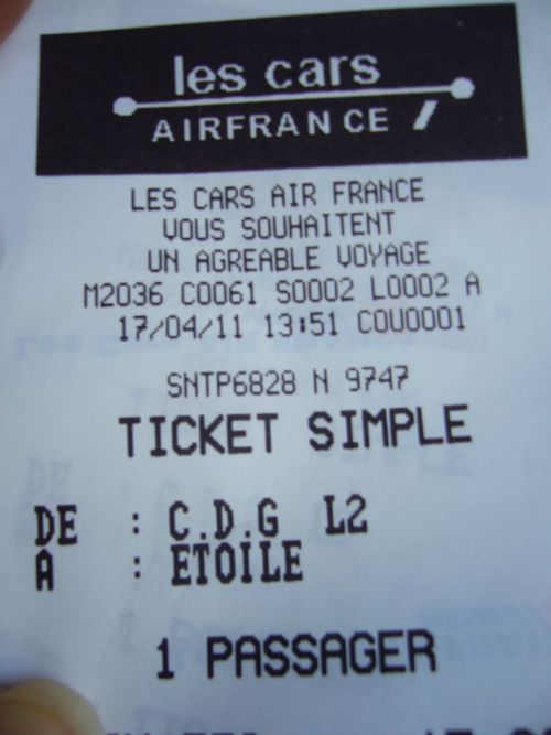 บินประมาณ 1 ชั่วโมง 15 นาทีนะคะ ก็มาถึง Charles De Gaulle ค่ะ ดีใจมากกกก ทีแรกไม่แน่ใจว่าจะทำ Tax Refund ที่ไหนดี ที่ Italy หรืว่าที่ ฝรั่งเศส ปรากฏขาออกนี่ ไม่เห็นที่ทำ refund นะคะ ตม.ก็ไม่มี ประมาณว่าบินจากเชียงใหม่ มา กรุงเทพค่ะ ไม่มีตรวจอะไรเลย พอมาถึงผึ้งเลือกนั่งรส Bus ของ Air France เข้าเมืองนะคะ ชัวร์ดี เพราะเค้าจะมี 2 สาย สายนึงมาจอดตรงประตูชัยเลยค่ะ สะดวกมากกก ไม่ต้องลากกระเป๋าขึ้นลงบันไดที่รถไฟใต้ดินด้วยค่ะ ใครจะเดินทางแบบนี้ลอง search ใน Google ดูนะคะ เพราะสะดวกมากรถก็ไม่ติดค่ะ มีอีกอันของ Roissy Bus จะเข้าไปที่ Opera เลยค่ะ ลองศึกษาดูว่าอันไหนใกล้โรงแรมกว่ากันค่ะ