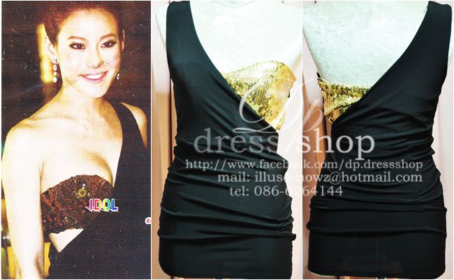 18.เดรสสีดำติดเลื่อมทอง เก๋มาก และเอ็กซ์ด้วย ผ้ายืดสีดำตัดทองติดเลื่อมสวยมาก คุณอั้มก๊ใส่แบบนี้ค่ะ