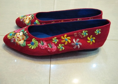 รองเท้าทรงบัลเล่ จากสยามค่ะ size 38 สายรัดยางยืด งานปักลายสวยมากค่ะ ตัวรองเท้าเป้นผ้าสักหลากสีแดงค่ะ ขาย 300 บาทค่ะ มือหนึ่งนะค่ะ