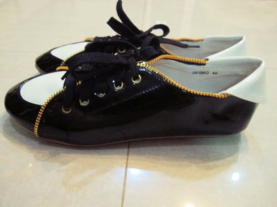 รองเท้าผ้าใบแฟชั่น จากสยามค่ะ size 39 หนังแก้วสีดำค่ะ เป็นซิปทองๆ เก๋มาก ขาย 350 บาทค่ะ มือหนึ่งนะค่ะ
