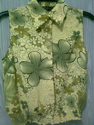 10. เสื้อแขนกุดสีเขียวลายดอก คอปก ด้านล่างจั๊มตรงเอง รอบอก 38 " ยาว 21"