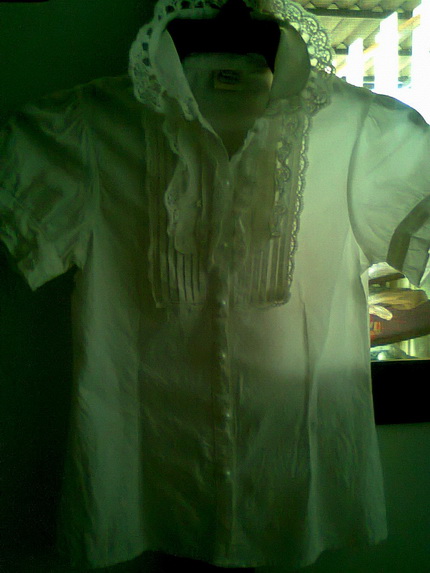19. เสื้อสีขาวแต่งละบายลูกไม้ แขนตุ๊กตา กระดุมมุก รอบอก 30 " ยาว 21.5"