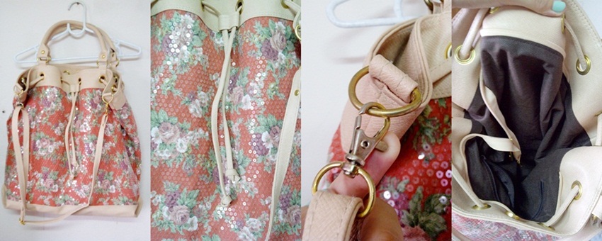 สีชมพูอมส้ม ไม่แปร๊ดไปน่ะค่ะ สีตามรูปเลยค่ะ (ไม่เพี้ยน) เก๋ที่มีปักเลื่อมใส่ทั้งกระเป๋า