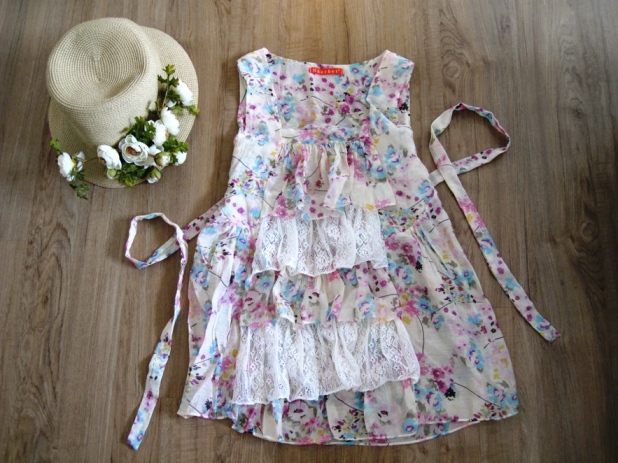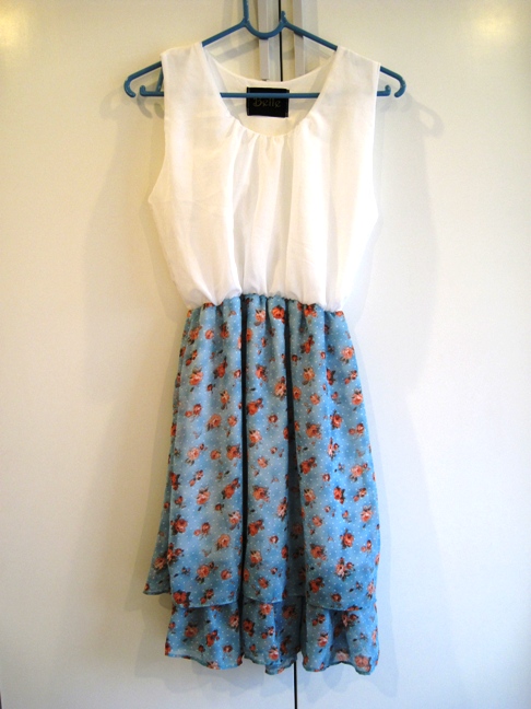 20.เดรสตัดต่อ ผ้าชีฟองสีขาวมีซับในด้านบน กระโปรงชีฟองลายดอกไม้พื้นฟ้า