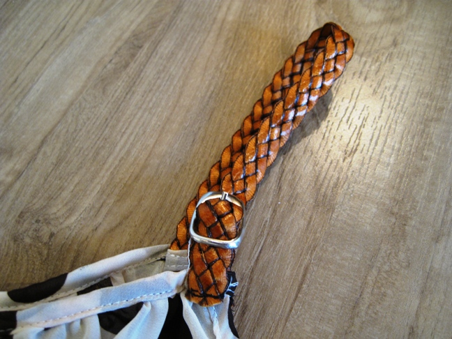 สายเสื้อเป็นเชือกเหมือนหนังถักค่ะ สีน้ำตาล