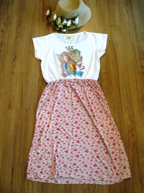 18.เดรสผ้ายืดค่ะ กระโปรงยาวลายดอกไม้ชมพู