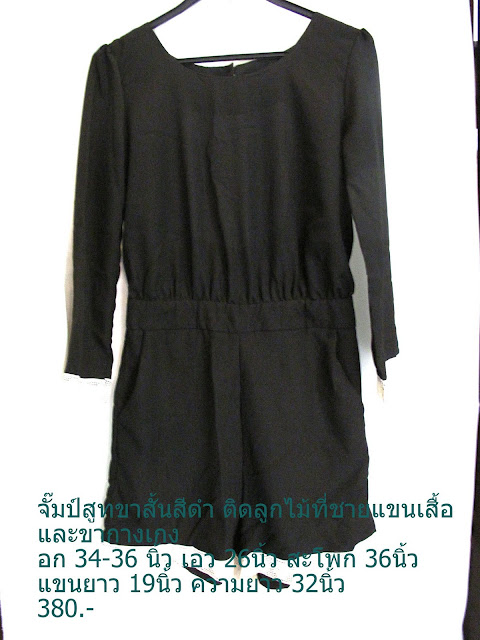 จั๊มป์สูทขาสั้นสีดำ ติดลูกไม้ที่ชายแขนเสื้อ และขากางเกง
