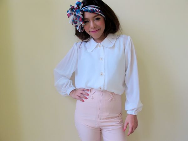 Detail : เสื้อเชิ๊ตสีขาวผ้าชีฟอง ประดับกระดุมดอกไม้