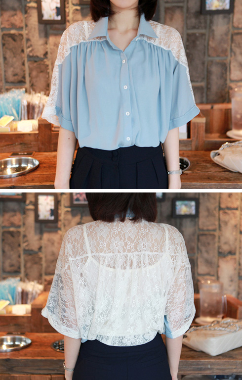 1. เสื้อเชิร์ต กระเป๋าด้านหน้าและชายแขนแต่งผ้าลูกไม้เพิ่มความหวานและวินเทจ