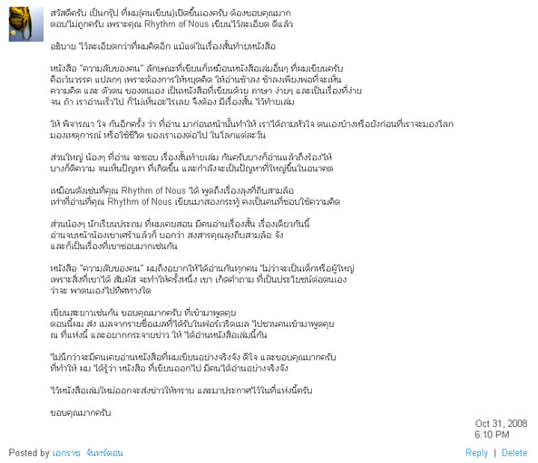 ไม่นึกว่าจะมีคนเคยอ่านหนังสือที่ผมเขียนอย่างจริงจัง ดีใจ และขอบคุณมากครับ