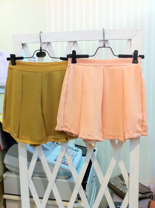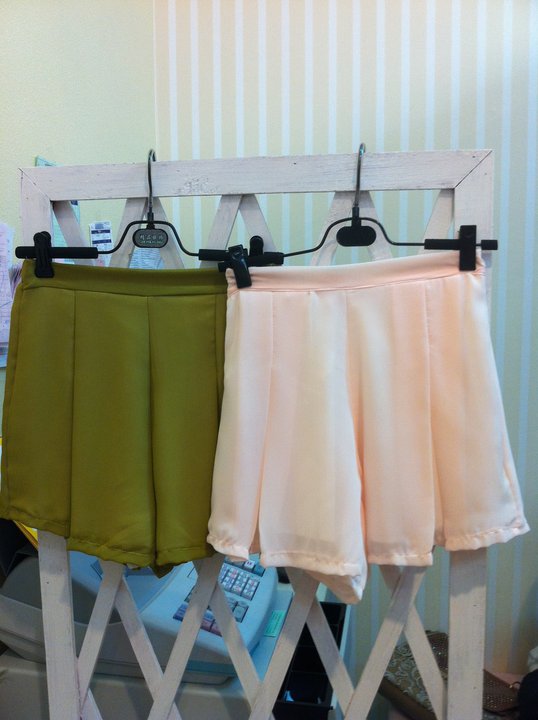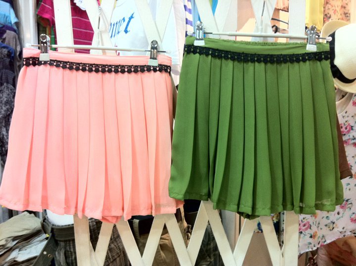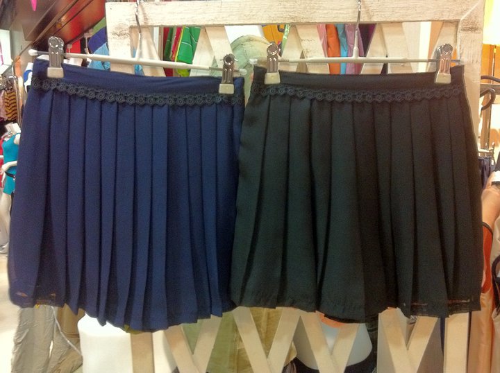 กางเกงกระโปรงชีฟอสีพื้นอัดพลีทประดับลูกไม้มีซับใน