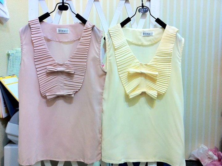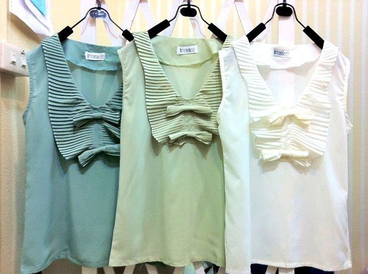 เสื้อแขนกุด คอวีจับพลีท โบว์สองชั้นผ้าชีฟองยืดเนื้อนิ่ม ไม่บางไม่ต้องใส่ซับใน อก 36 ยาว 24 ตัวละ 300/3ตัวขึ้นไปตัวละ 250