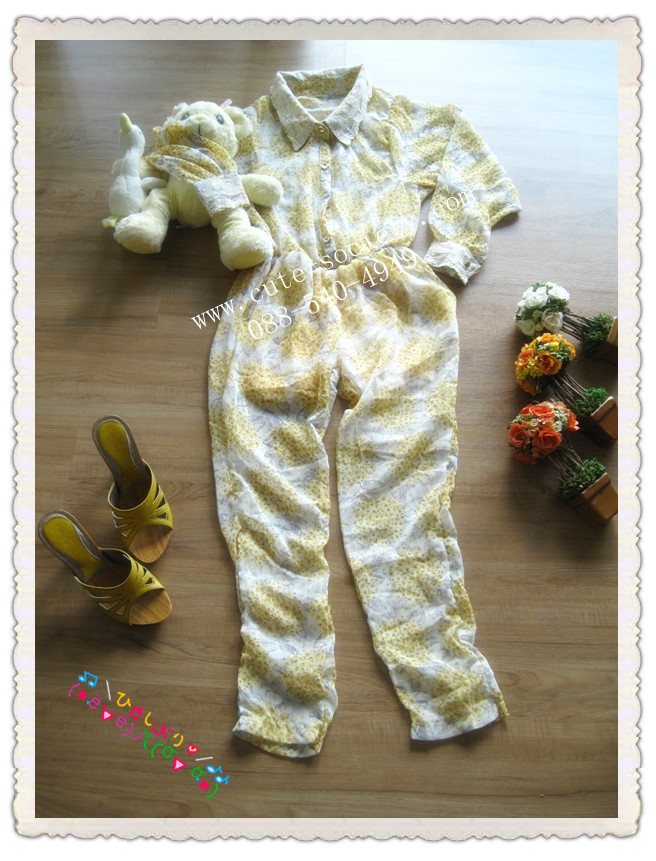 รหัส 1106-011 : Jumpsuit ผ้าชีฟอง คอเสื้อและข้อมือเป็นลูกไม้ ผ้าลายดอกไม้เล็กๆสีเหลืองอ่อน สไตล์วินเทจตัวจริง ใส่แล้วสวยน่ารักค่ะ ราคา 620 บาท