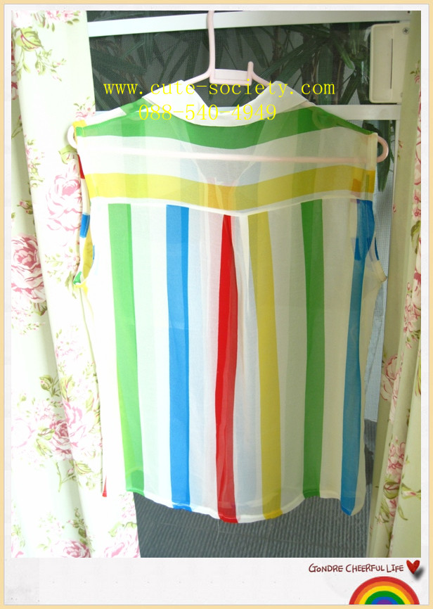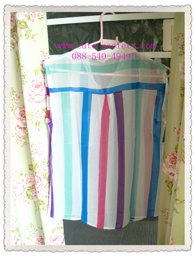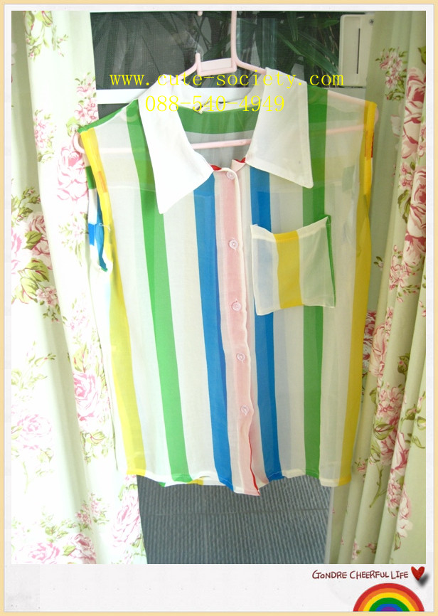 รหัส 1106-042 :เสื้อแขนกุด ผ้าไหมชีฟอง ลายทางพื้นสีขาว โทนเหลืองเขียวแดง สไตล์มาร์ค จาคอบค่ะ ขาย 350 บาท