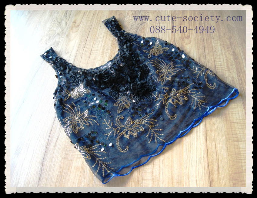 รหัส 1106-025 : เสื้อผ้าซีทรูสีน้ำเงินเข้มปักเลื่อมดอกไม้สีทอง เก๋ๆงาน hand-made มีดอกไม้ขดๆที่ด้านหน้า ใส่ได้หลายสไตล์ค่ะ ราคา 540 บาทค่ะ