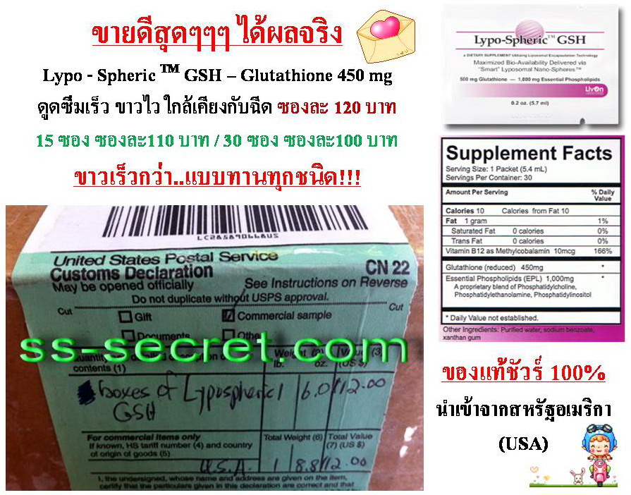 * ทำอยู่ในรูปแบบ Liposome ซึ่งทำให้กลูต้าไธโอนสามารถดูดซึมได้ 100% จริง