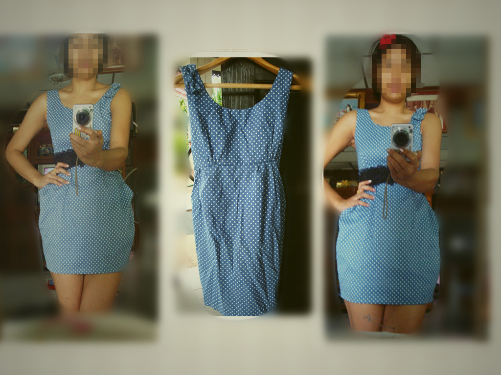 เดรสยีนส์สั้น ลายจุด น่ารัก ซื้อมาไม่เคยใส่นะค่ะ เพราะมันค่อนข้างสั้นสำหรับแม่ค้า (แม่ค้าสันหลังยาว 555)
