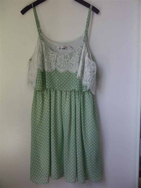 U03 :Used เดรสลายจุดสีขาว-เขียวอ่อน แบรนด์เกาหลี เอวยางยืด สายปรับได้ค่ะ