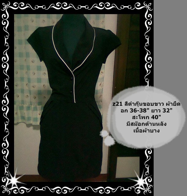 16. สีดำกุ๊นแขนสีขาว ผ้ายืด ทิ้งตัว อก 36-38" ยาว 32" สะโพก 40" ด้านหลังมีสม๊อกเอว