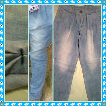3. kk10 กางเกงยีนส์ ทรงบอลลูน ด้านหน้าติดกระดุม ด้านหลังเป็นเอวยางยืด size L (ยืดได้ถึง 32") ยาว 34.5"
