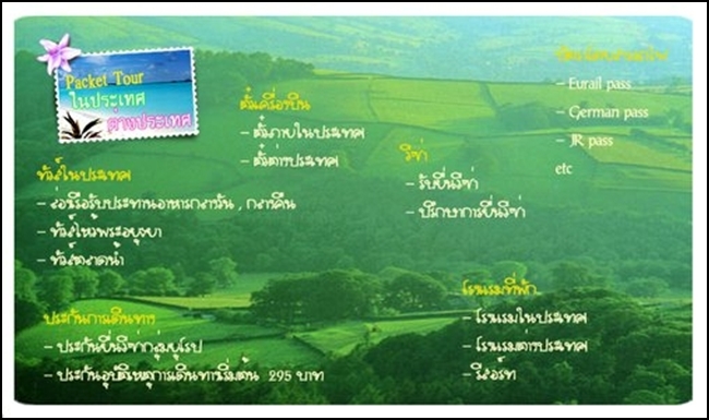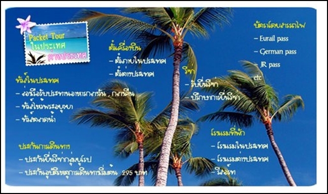 - บริการจองตั๋วรถไฟต่างประเทศ ทั้งในยุโรป อเมริกา และ ญี่ปุ่น ในราคาประหยัดอาทิ รถไฟยูโรสตาร์ รถไฟเจแปนเรลล์พาส รถไฟชินคันเซ็น เป็นต้น