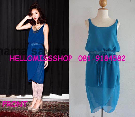 เดรสแขนกุดผ้าชีฟองสีฟ้า เอวยางยืดผูกโบว์ กระโปรงป้ายด้านหน้า ยี่ห้อ mama say zeed