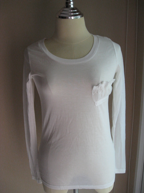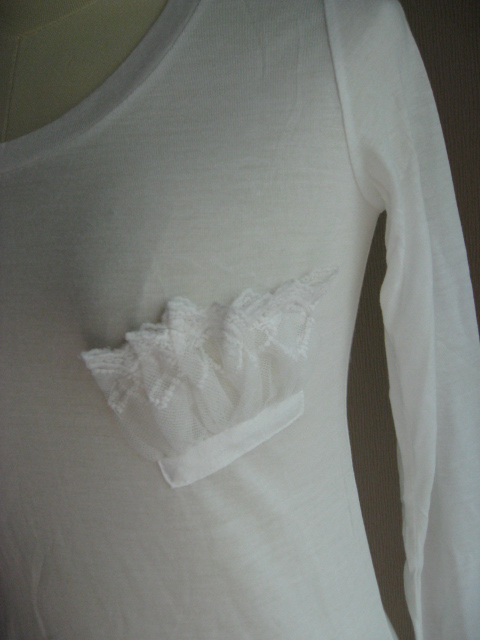 เสื้อยืดแขนยาวผ้าเนื้อนุ่ม สีขาวตกแต่ลูกไม้ที่อกเสื้อเหมือนกระเป๋า น่ารักค่ะ ราคา 300 ยาท