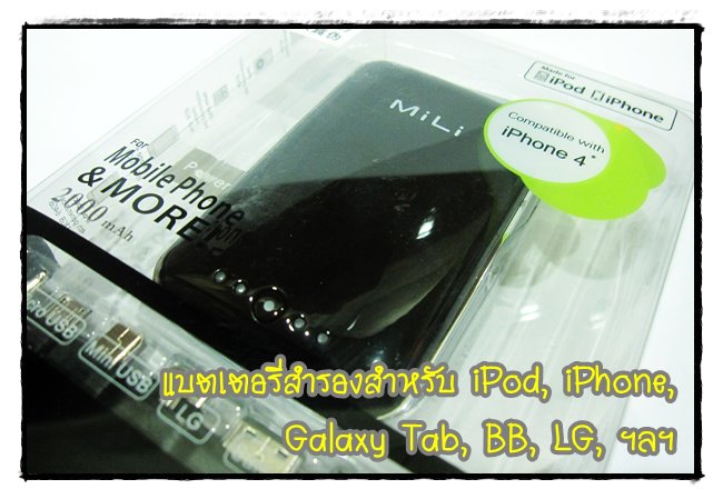 แบตเตอรี่สำรองแท้ยี่ห้อ MiLi สำหรับน้อง iPhone, iPod, iPad, BB, Galaxy Tab และมือถือรุ่นต่างๆ ขนาดความจุ 2000 mAh ราคา 1,100 บาท