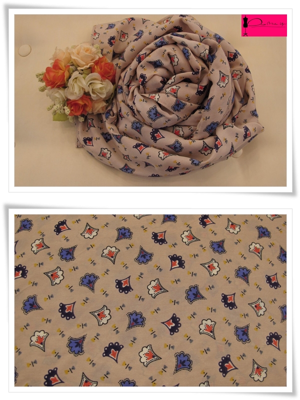 Details : ชีฟรองเนื้อนิ่มม ลายนกน้อยพื้นสีครีม ตัวนกเป็นสีน้ำตาลเข้ม,ฟ้า,ส้ม