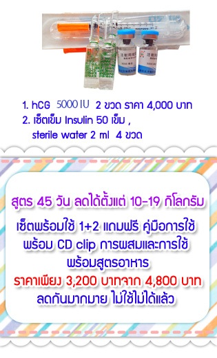สุดค้มกับแพ็คเก็จ 45 วัน ทลายไขมัน 8-18 กิโลกรัม (hCG 2 ขวด) แพ็คเก็จละ 3200 บาท จากราคาปกติ 4800 บาท