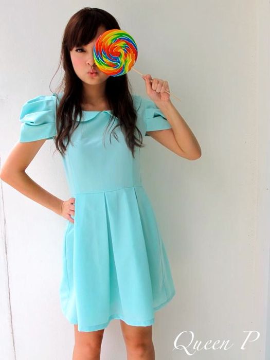 Detail : เดรสผ้าไฮทวิสสีเขียวมิ้น แต่งแขนจับจีบ แต่งกระโปรงทวิส