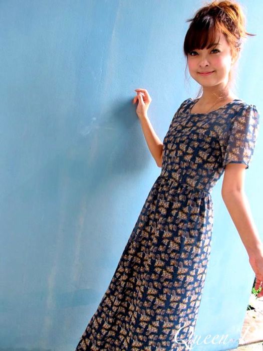 Detail : เดรสยาวผ้าชีฟองสีกรมท่าลายแมว
