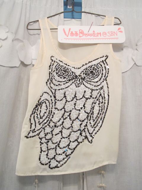 มือหนึ่งค่ะ เสื้อกล้ามลายปักนกฮูก สีออกครีมๆ ผ้าลื่นๆไม่บางมากค่ะ งานเกาหลี ขาย 700 บาทค่ะ