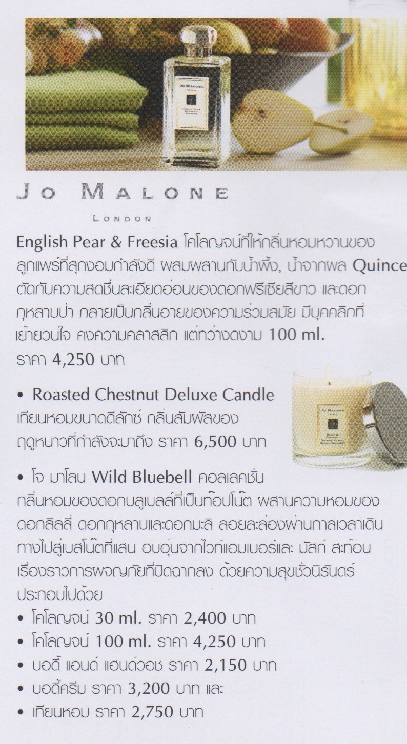 -Jo Malone Cream มีมาสองกระปุก และมี Cologne นะค่ะซื้อจากKing Powerอยากดูใบเสรจจ่ายตังบอกได้ค่ะจะScanไปให้ดูทันทีไม่มีกั๊ก ราคาตามKINGPOWER เลยจ้าา มีกลิ่น English Pear&Fresia ซึ่งถือได้ว่าเป็นกลิ่นSignatureเลยก้อว่าได้ แอบไปถามBA ที่ Harrods เค้าบอกกว่ากลิ่นนี้สำหรับผู้มีรสนิยมจริงๆค่ะ แต่ไครต้องการแนวหวานๆใสๆดูวัยรุ่นลงมาหน่อยต้องกลิ่น Wild Bluebell ไครจะซื้อไปฝากเป็นของขวัญนี่เหมาะสุดๆค่ะ แนะนำ