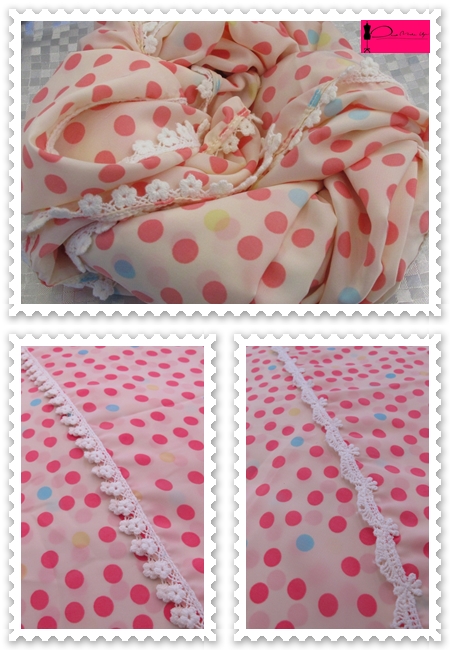 Details : ลายจุดสีชมพู พื้นครีม เพิ่มความหวานด้วยลูกไม้น่ารักๆ มีให้เลือก 2 แบบค่ะ (เป็นชีฟรองเนื้อนุ่มพิมพ์ลาย 2 ด้านจ้า)