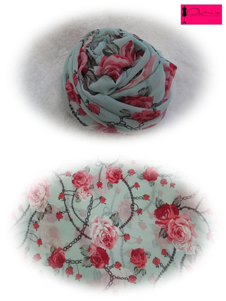 Details : ลายดอกกุหลาบคาดด้วยโซ่เก๋ๆพื้นสีเขียวมินต์ เป็นเนื้อชีฟรองละเอียดนุ่มมือค่ะ