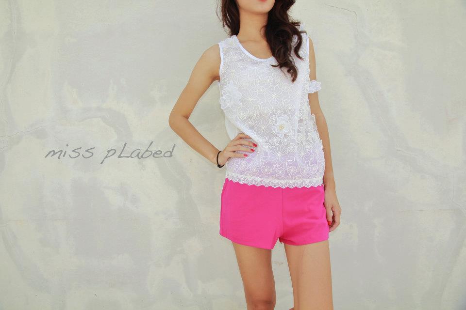 เสื้อแขนกุดสีขาว ตกแต่งเป็นดอกไม้ด้านหน้า ตรงปลายเสื้อเป็นลายลูกไม้ น่ารักมากค่ะ