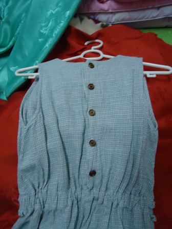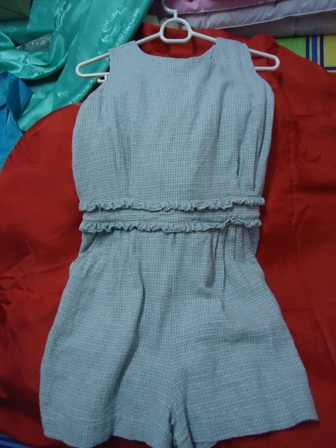 จั๊มสูท สีฟ้าอ่อนลายตารางเล็กๆ คุณหนูมากๆ มีตำหนินิดหน่อย แต่สามารถเย็บได้จ้า ส่งต่อ 130