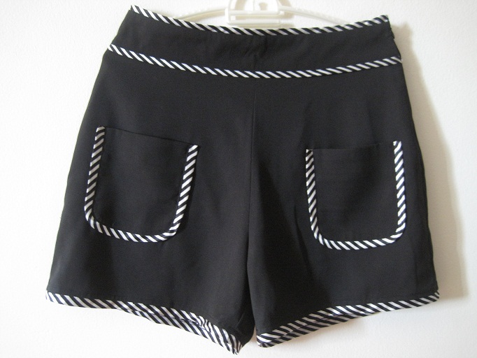 B005. 250 b. กางเกงขาสั้นสีดำ เล่นลายตัดขอบเก๋ๆ ผ้าใส่สบาย ทรงสวยค่ะ เอว 30 นิ้ว สะโพก 42 นิ้ว ยาว 16 นิ้ว
