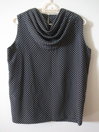 T003. 200 b. เสื้อแขนกุดคอเต่าสีดำจุดขาว ทรงสวย ผ้าดี มีซับในค่ะ อก 40 นิ้ว ลำตัว 40 นิ้ว ยาว 24 นิ้ว